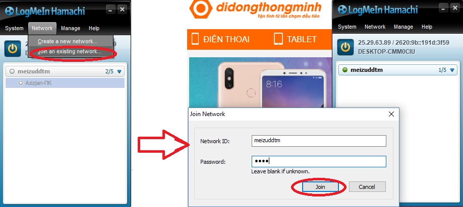 Install, then open app LogMeIn Hamachi, log in or sign up an account.