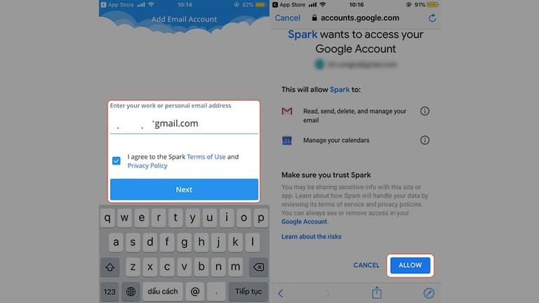Bước 2: Mở ứng dụng Spark lên và tiến hành nhập email bạn muốn dùng để hẹn giờ gửi mail > Sau đó hãy cho phép ứng dụng dùng tới các quyền như “đọc, gửi, xóa, quản lý email và quản lý lên lịch gửi mal” bằng cách chọn “Allow” như ảnh dưới.