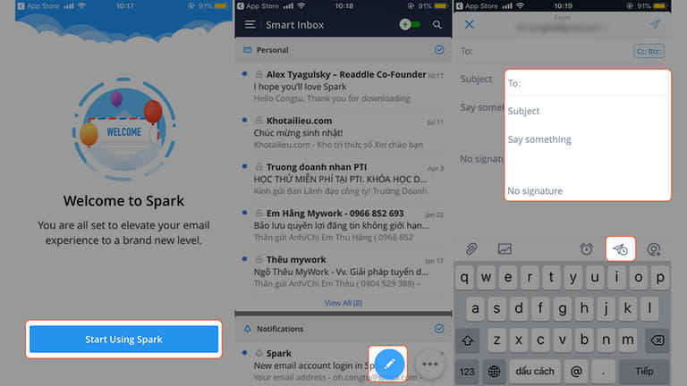 Bước 3: Chọn Start Using Spark để tiến hành vào giao diện chính của ứng dụng. Ở giao diện chính của ứng dụng hãy chọn biểu tượng cây bút để tạo một email mới > Tiến hành nhập email người nhận, tiêu đề, nội dung > Để hẹn giờ chọn vào biểu tượng mũi tên kèm đồng hồ ở dưới.