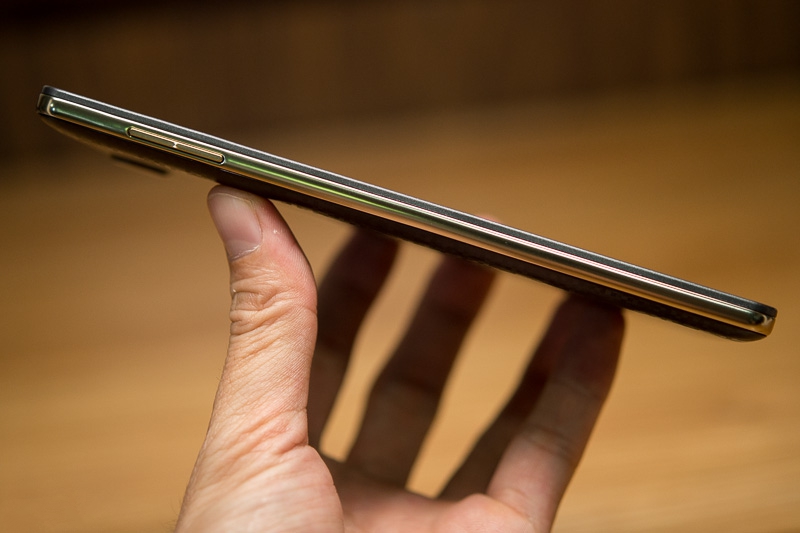 Sườn máy được bo tròn và được mạ vàng nhìn khá ấn tượng và chắc chắn. Bên cạnh phải, phía trên là nút khóa/mở màn hình đối xứng ở cạnh trái là nút tăng/giảm âm lượng. Đó là hai nút cứng duy nhất trên máy. Ở cạnh dưới của máy chúng ta có mic thoại và cạnh trên thì có lỗ cắm tai nghe 3,5mm và lỗ cắm MicroUSB.