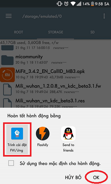 Bước 3: Làm tương tự bước 2 nhưng lúc này các bạn bấm vào file Firmware có tên: Mili_wuhan_1507_Vi_Vi.fw Bấm vào file đó sẽ hiện lên bảng hoàn tất bằng hành động thì anh em chọn Trình cài đặt FW/ứng và bấm OK để cài đặt