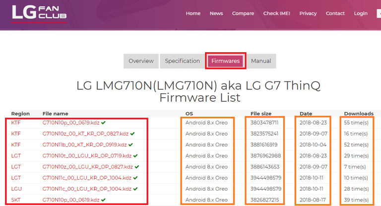 Các bạn bấm vào Firmwares sẽ hiện ra các phiên bản phần mềm KDZ như hình, bấm vào phần màu đỏ tên Filename để tải về