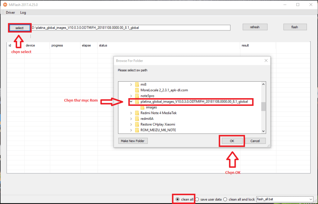 – Mở Mi Flash lên và chọn tới bản rom: