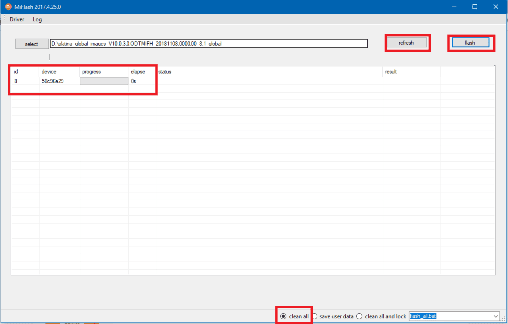 Bấm refresh cho tới khi hiện lên cổng COM hoặc id thiết bị như hình và tích vào clean all