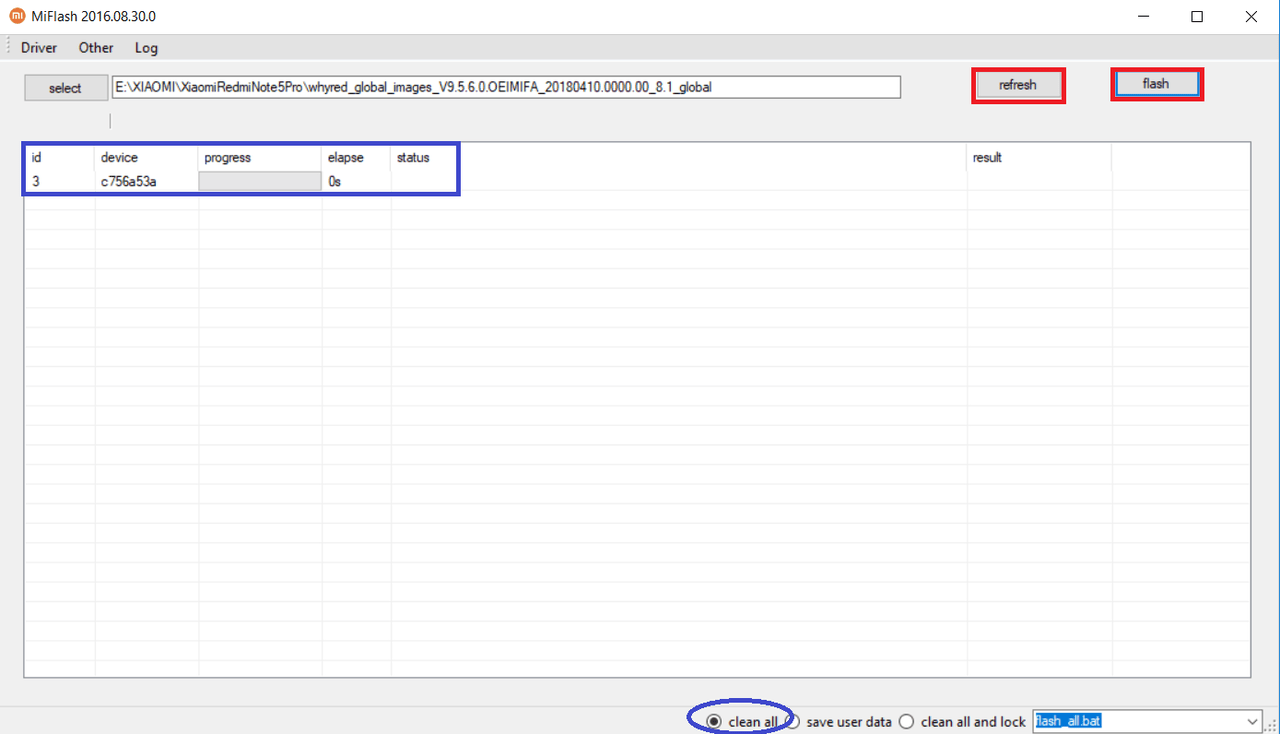 Bấm refresh cho tới khi hiện lên cổng COM hoặc id thiết bị như hình và tích vào clean all (nếu bạn muốn giữ lại giữ liệu ở bộ nhớ trong thì tích vào mục thứ 2 ở giữa save user data)