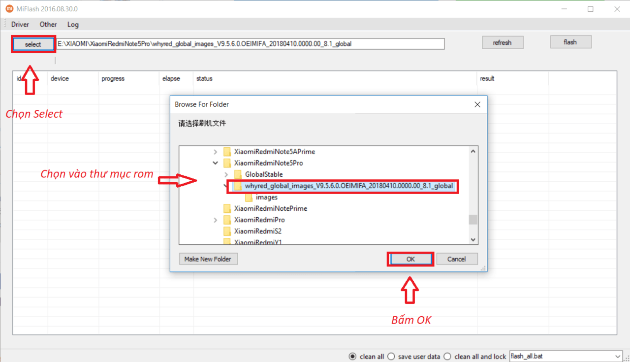 – Mở Mi Flash lên và chọn tới bản rom như hình dưới