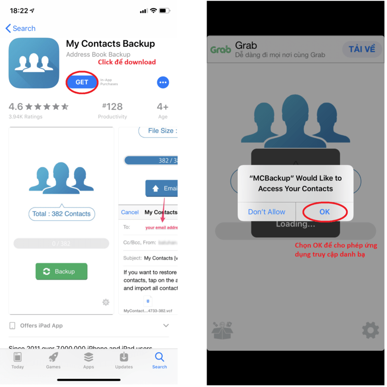 - Sau khi tải về Contact Backups trên Appstore. Mở ứng dụng lên và chọn OK để cấp quyền truy cập Danh bạ cho ứng dụng.
