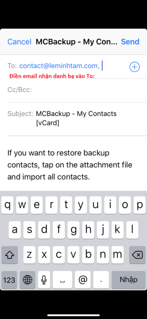 - Điền email của bạn vào dòng To: rồi bấm Send để gửi danh bạ tới email của bạn.