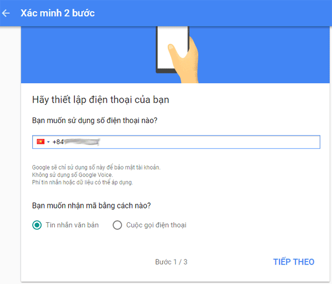 Bước 5: Phần này, Gmail sẽ yêu cầu bạn nhập số điện thoại dùng để nhận mã xác minh cũng là số tài khoản dùng để bảo mật tài khoản của bạn luôn. Gmail sẽ xác minh theo một trong 2 cách: tin nhắn văn bản và cuộc gọi thoại. Bạn chọn xong rồi nhấn Tiếp theo nhé.