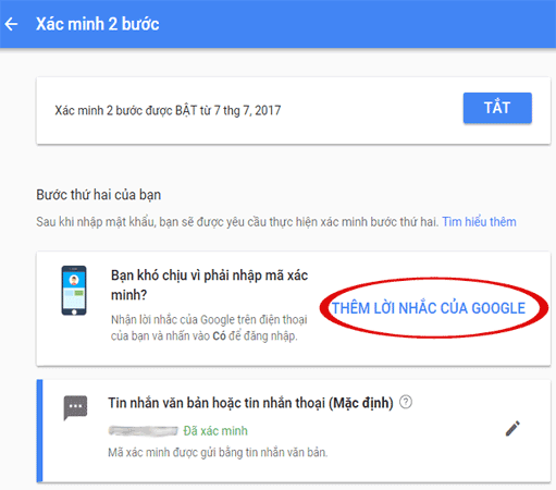 Nếu không muốn lần nào đăng nhập Gmail cũng phải nhập mã xác nhận, bạn có thể chọn THÊM LỜI NHẮC CỦA GOOGLE, rồi làm theo các hướng dẫn trên màn hình, để nhận thông báo từ Google trên điện thoại và đăng nhập với một lần chạm. Hoặc, trong quá trình đăng nhập Gmail, nếu dùng trên máy tính cá nhân, bạn hãy để ý dòng Dont ask again on this computer, tích vào tùy chọn đó để không phải nhập mã xác nhận nữa. Nhớ là chỉ nên chọn tùy chọn này khi bạn dùng một mình một máy, trong môi trường an toàn.