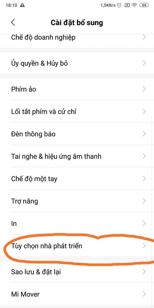 Đầu tiên các bạn cần truy cập Cài đặt Cài đặt bổ xung Tùy chọn phát triển. Nếu máy của bạn chưa kích hoạt mục Tùy chọn nhà phát triển hãy truy cập vào mục Cài đặt Giới thiệu về điện thoại ấn 7 lần vào mục Phiên bản MIUI.