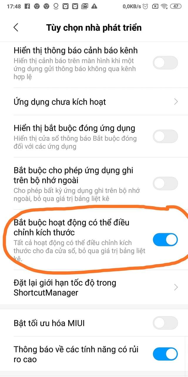 Tiếp theo chọn chọn mục “Buộc các hoạt động có thể thay đổi kích thước” sau đó khởi động lại thiết bị.