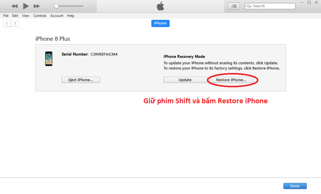 Cách cài đặt thì cũng tương tự như cách 1, nhưng thay vì click thằng vào Restore iPhone, chúng ta sẽ giữ thêm phím Shift và click chọn vào Restore iPhone.