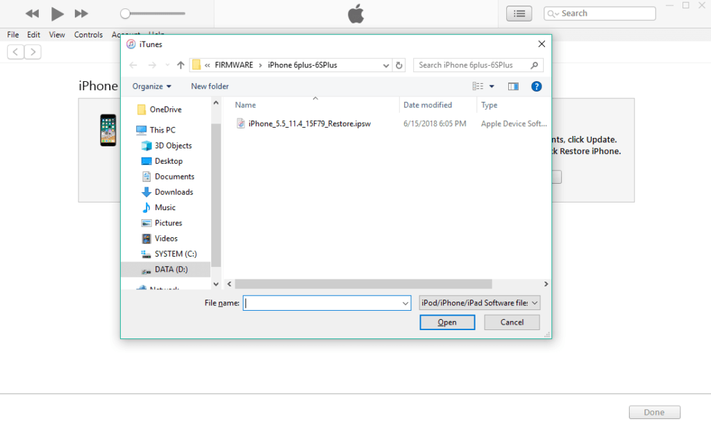 Sau đó iTune sẽ hiện lên cửa sổ thư mục dẫn đến file firmware mà chúng ta vừa download về.