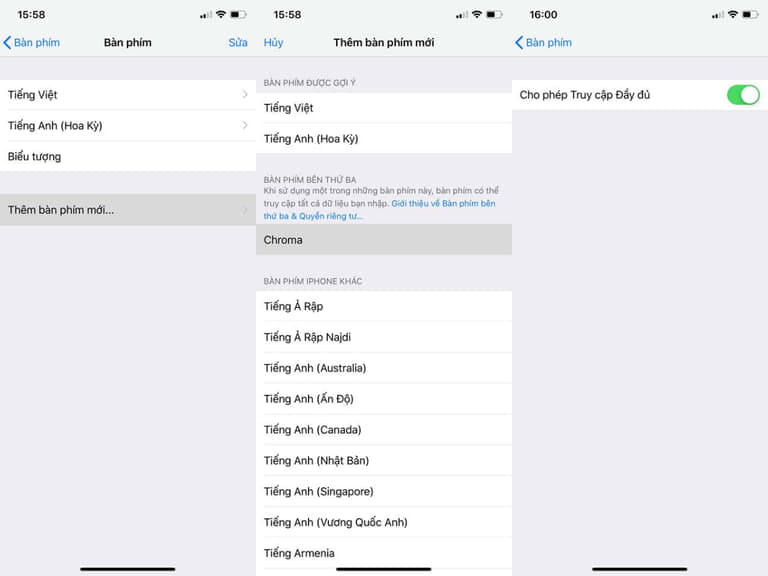 Bước 3: Tiếp tục chọn vào “Thêm mới bàn phím” > Chọn bàn phím “Chroma”. Sau đó tiếp tục chọn vào “Chroma” và bật mục “Allow Full Access” lên.