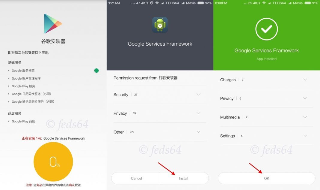 – Sau đó máy sẽ tự động tải từng file dịch vụ google xuống bạn chỉ cần chờ nó tải xong file nào hỏi cài đặt thì bấm cài đặt thôi, như nhình dưới máy sẽ hỏi bạn có cài đặt google service framework không, bấm chọn install rồi chọn ok như hình đến khi nó cài xong và làm lần lượt với những file tiếp theo.