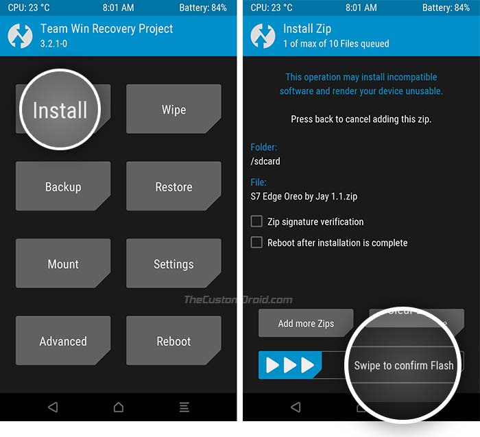 - Chọn install tìm đến file S7 Edge Oreo by Jay 1.1.zip chọn Flash