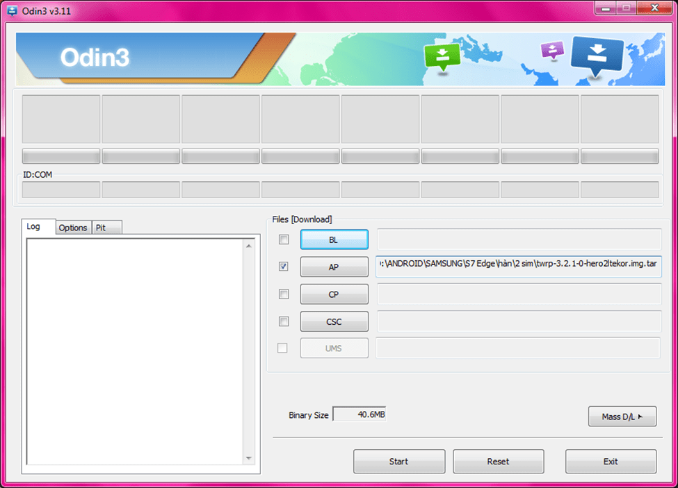 - Khởi chạy Odin và kết nối S7/S7 Edge (đang ở chế độ Download) với PC thông qua cable