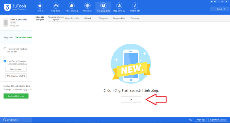 B5: Khi 3uTools đã flash xong, bạn bấm chọn OK để xác nhận