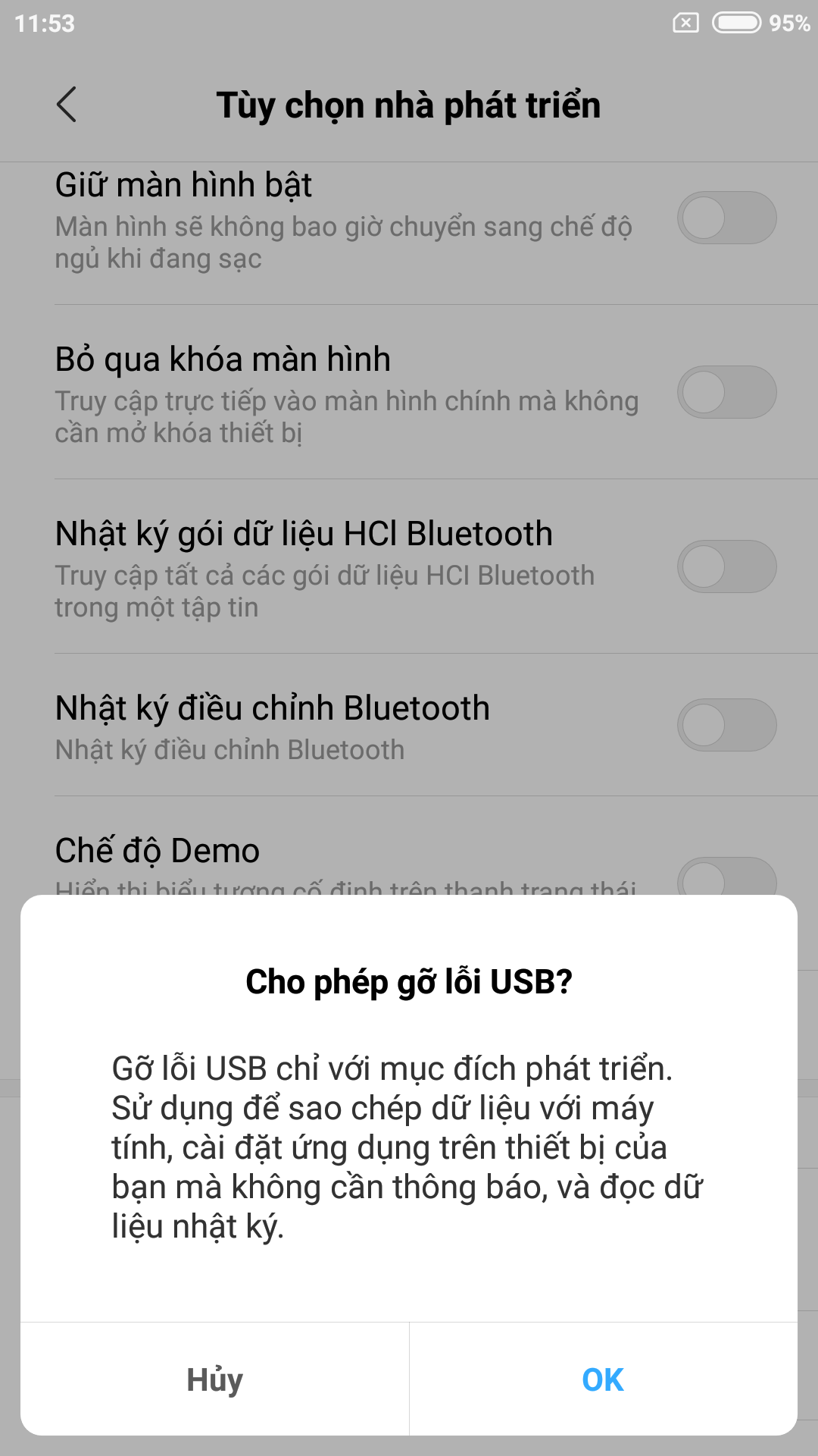 - Trên Mi 4 bật USB Debug (cài đặt > giới thiệu điện thoại > chạm 7 lần vào MIUI version, trở lại vào cài đặt bổ sung > tùy chọn nhà phát triển > bật gỡ lỗi USB)