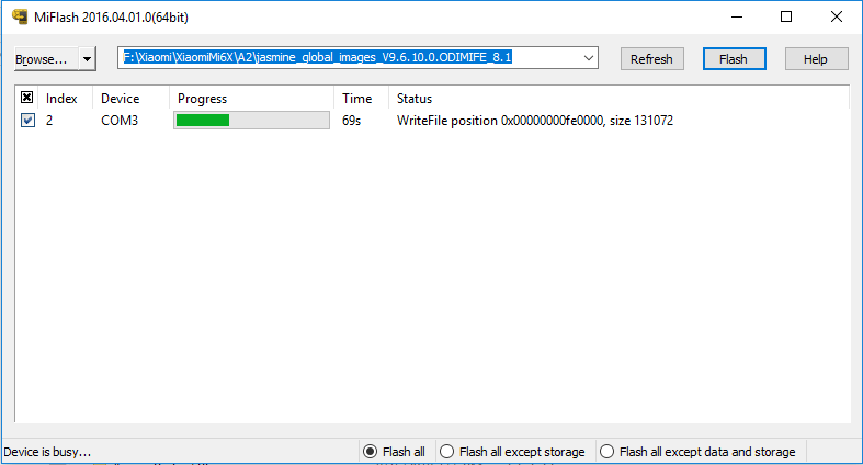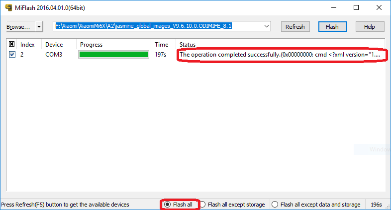 Bước 5: Để ý ở dưới cuối của phần mềm Mi Flash các bạn nhớ tick vào phần Clean all hoặc Flash all để xóa hết dữ liệu và làm sạch máy, tuyệt đối ko được tick vào phần Clean all and Lock vì bước này sẽ làm khóa lại bootloader của máy khiến máy của bạn bị treo rec đỏ.