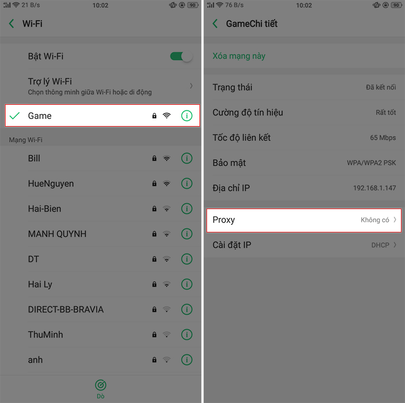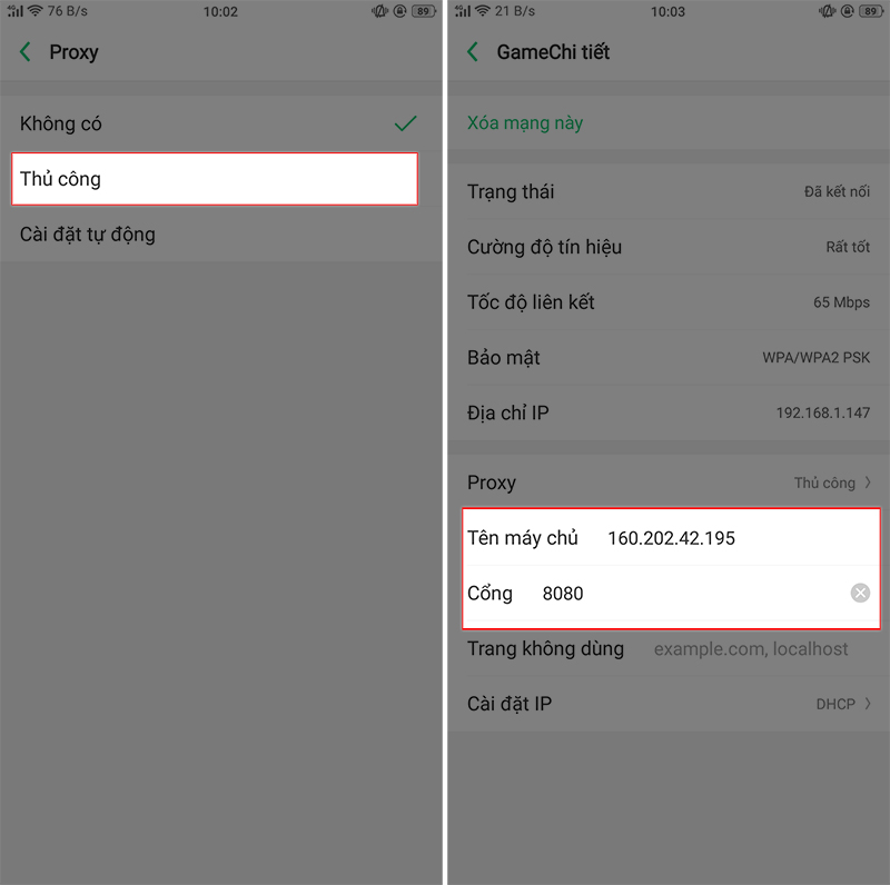 Đối với Android, bạn truy cập vào Cài đặt > Wi-Fi > Chọn vào mạng Wi-Fi đang kết nối > Chọn vào mục Proxy > Thủ công.