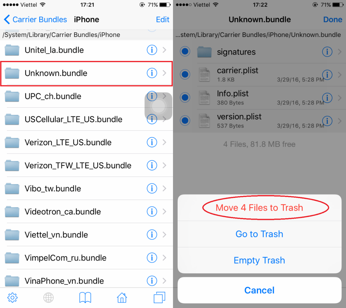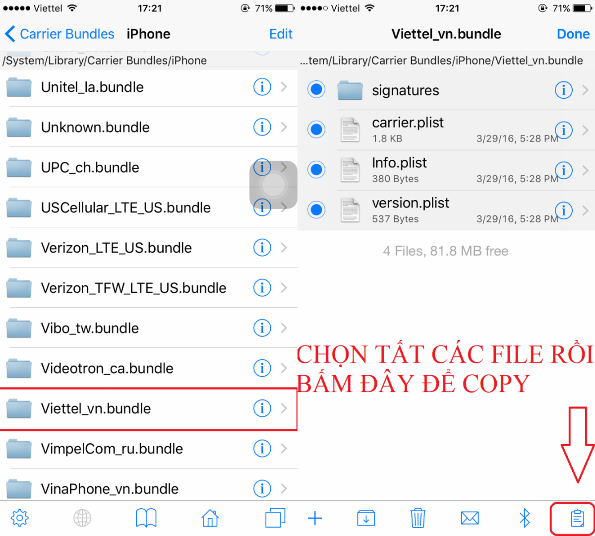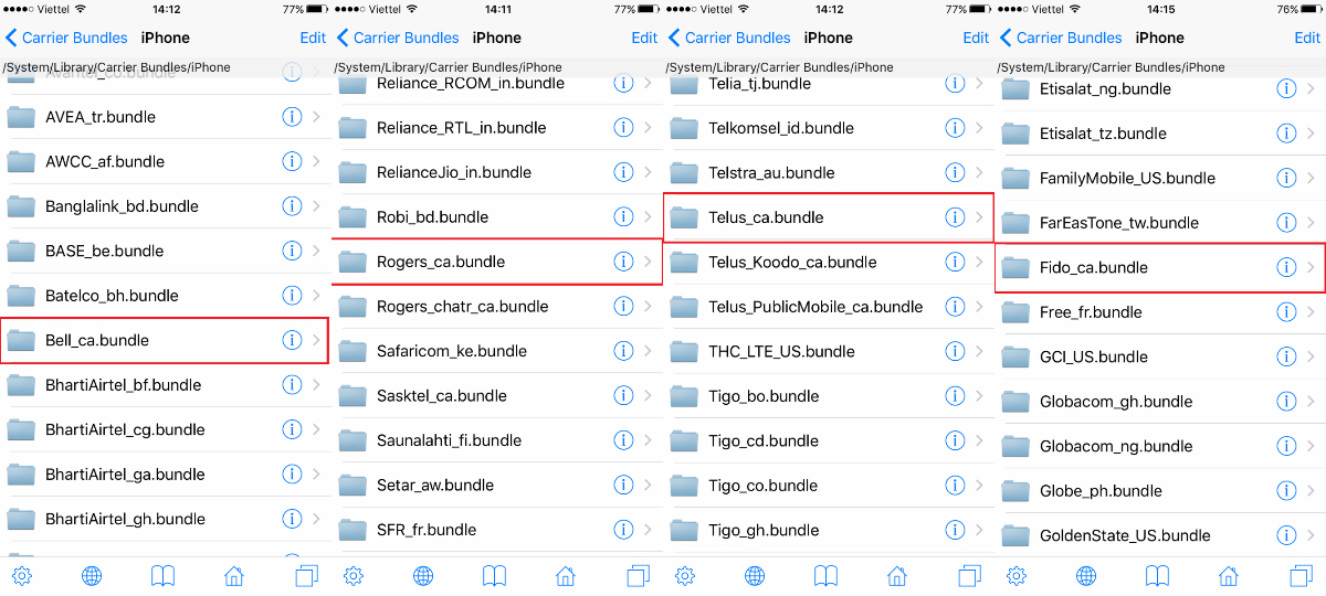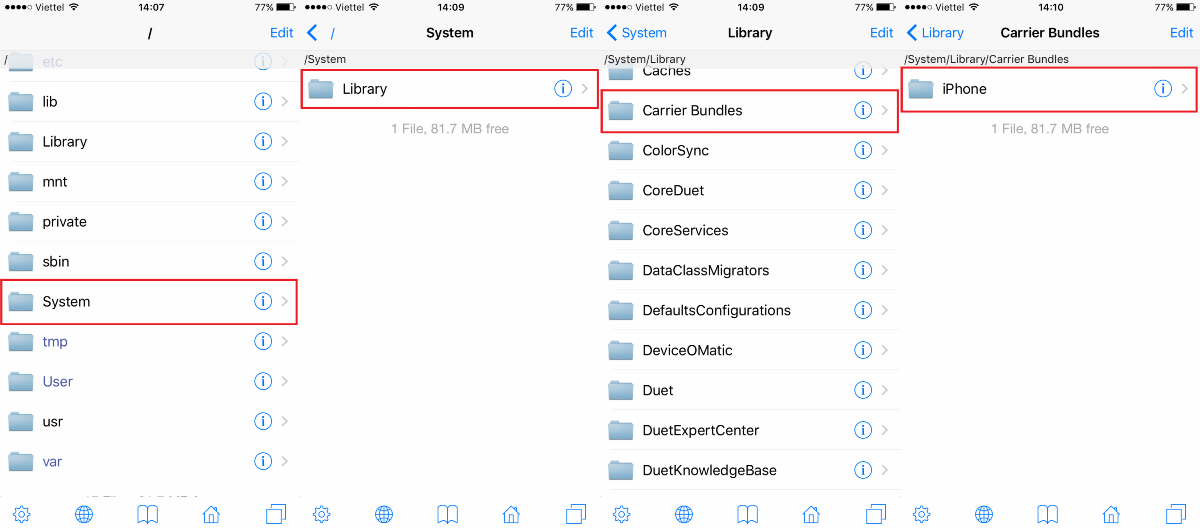 Truy cập vào đường dẫn /System/Library/Carrier Bundles/iPhone