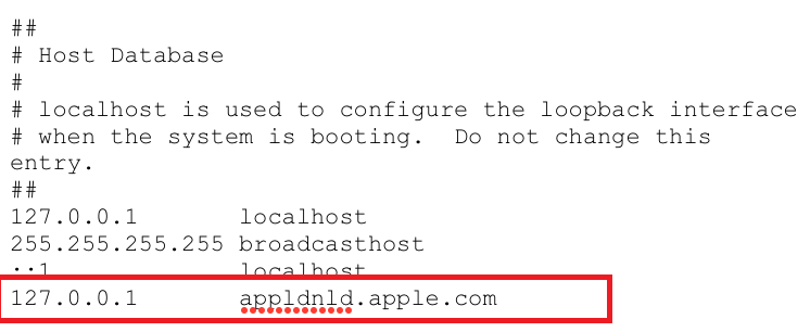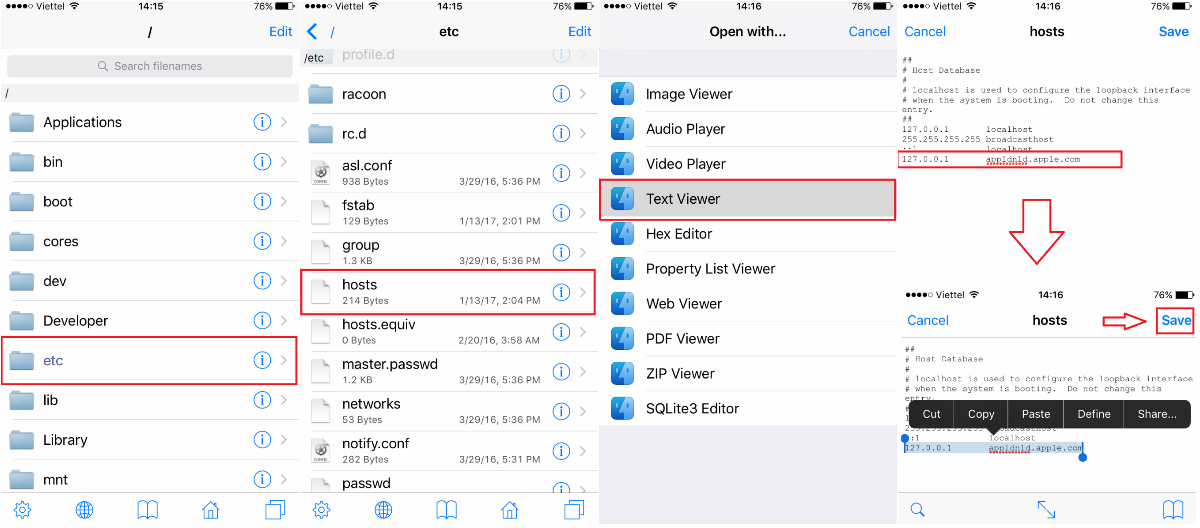 Thoát ra thư mục gốc bằng cách bấm back khi nào không back ra được nữa thì thôi, lúc này tìm thư mục etc rồi vào bên trong bấm mở file Host mở với dòng Text Viewer như ảnh dưới. Tại đây ta viết thêm 1 dòng : 127.0.0.1 appldnld.apple.com