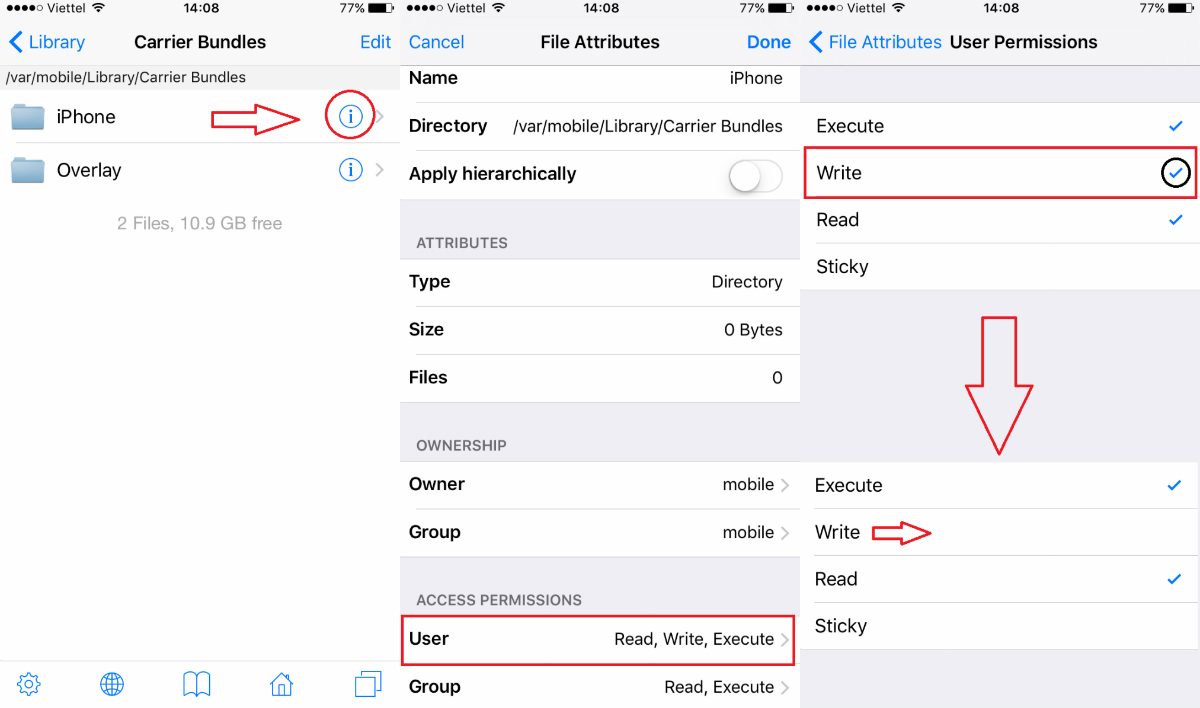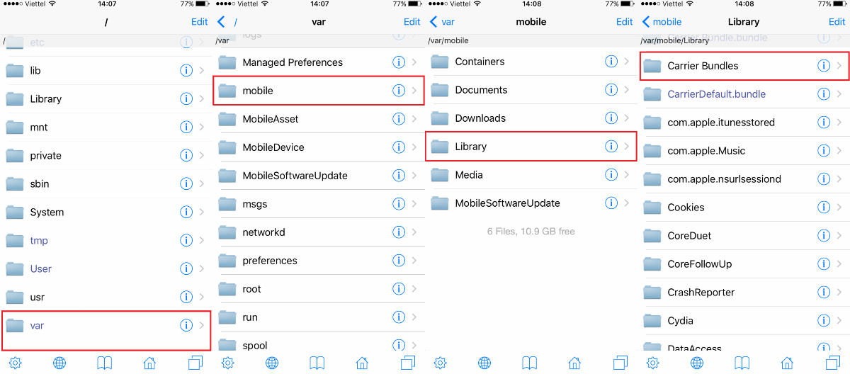 /var/mobile/Library/Carrier Bundles hoặc thao tác chọn theo dấu đỏ như hình dưới đây :