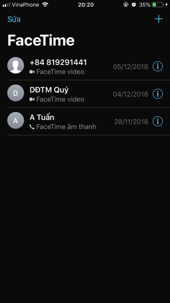 Bước 3: Các bạn chọn vào 2 người một danh sách sẽ hiển thị cho bạn ba tùy chọn: Âm thanh, FaceTime và Thông tin.