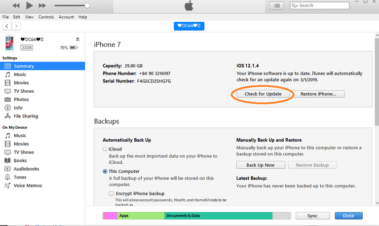 Sau đó cắm cáp kết nối iPhone và mở itunes lên giữ Shift bấm vào “Update” hoặc “Check for Update”