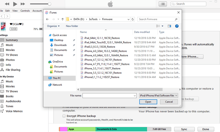 Tìm đến thư mục C:\3uTools\Firmware và chọn firmware vừa tải về và bấm ” Open “