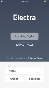 Bước 3: Mở app Electra Chọn vào nút Jailbreak để bắt đầu quá trình jailbreak. Nếu Bạn không muốn cài đặt sẵn các tweaks kèm theo thì Bạn tắt tùy chọn nó đi.