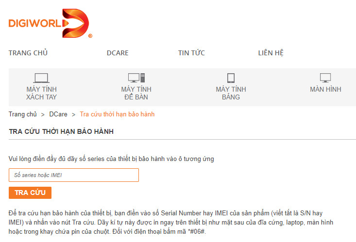 C1: Vào trang tra cứu hạn bảo hành của Digiworld, điền số IMEI vào form để kiểm tra