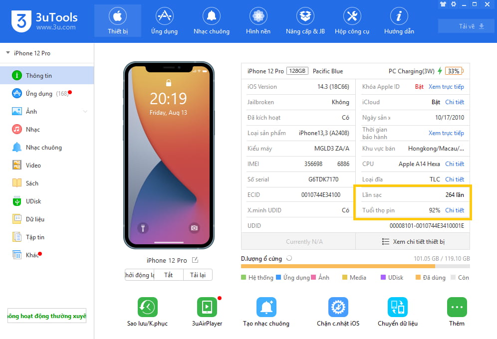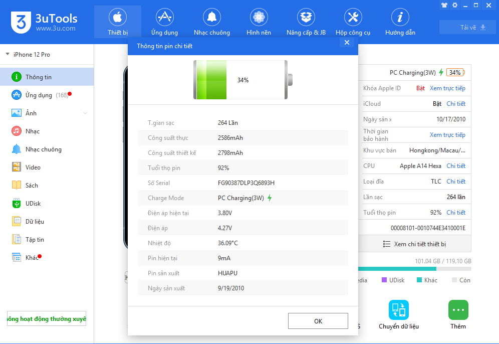 Bước 2: Giao diện phần mềm 3U Tools hiện ra số lần sạc và dung lượng còn lại của Pin hiện ra ngay phía bên phải.