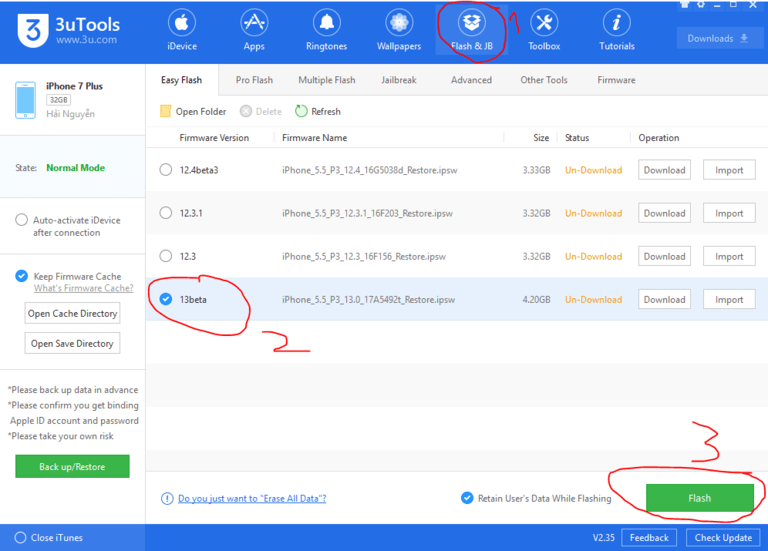 – Bước 2 : Sau khi cập nhật, mở 3uTools lên, chuyển qua tab Flash & JB. Bấm chọn Download ở mục 13beta để tải IPSW về máy (tiến trình này có thể hơi lâu do file tải không nằm trên server Apple)