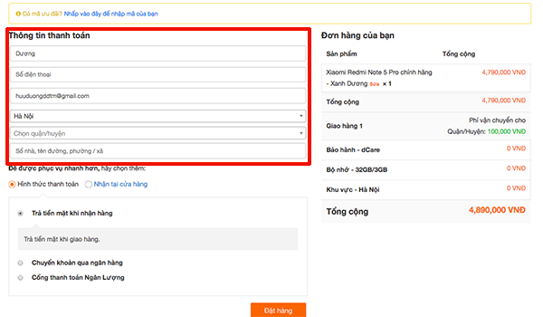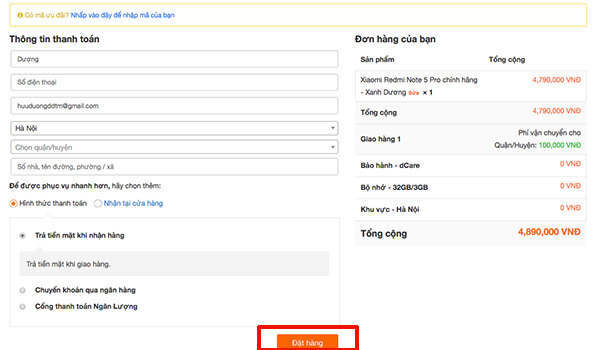 B6: Cuối cùng chúng ta bấm vào phần đặt hàng.