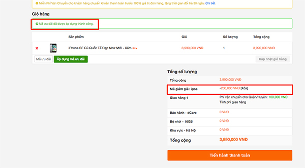 Sau khi đã nhập code giảm giá thành công chúng ta tiến hành thanh toán