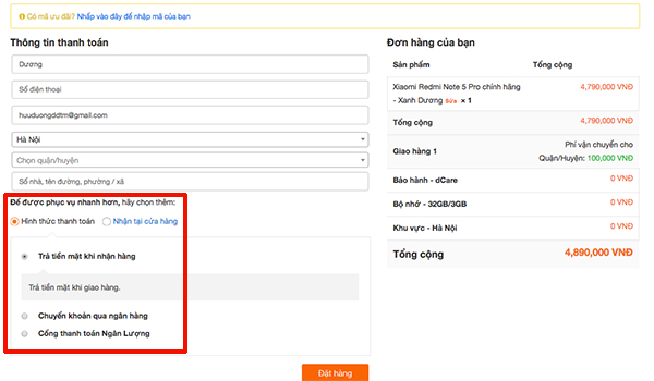 Tiến hành nhập mã ưu đãi, thanh toán