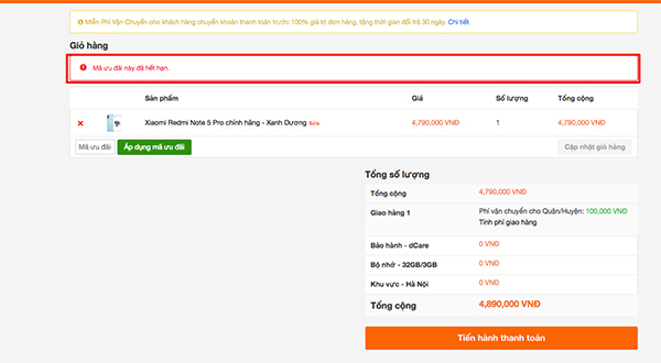 Khi bạn nhập không thành công sẽ có dòng chữ đỏ hiện trên màn hình ” Mã ưu đãi này đã hết hạn ” có thể bạn đã nhập đúng code giảm giá nhưng vẫn không thành công là vì bạn đã dùng code hết hạn hoặc số lượng code giảm giá cho sản phẩm này đã được dùng hết.