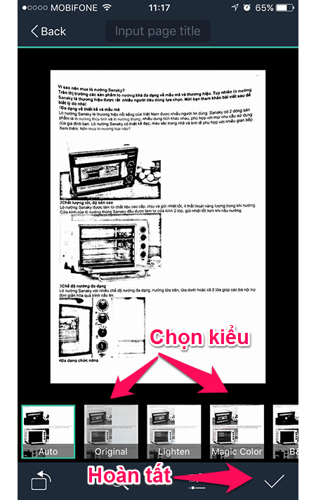 - Sau khi nhấn hoàn tất, ứng dụng sẽ sử dụng cách thuật toán để loại bỏ vùng ảnh thừa, chuyển thành ảnh đen trắng tương tự như khi bạn sử dụng máy scanner. Bạn cũng có thể chọn nhiều kiểu ảnh sao cho hợp mắt. Cuối cùng là lưu lại.