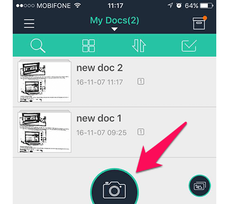 - Để bắt đầu scan tài liệu, bạn mở CamScanner, nhấn vào biểu tượng hình máy ảnh.
