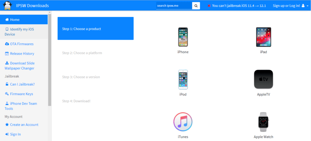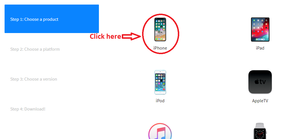 - Để down các phiên bản firmware của iphone thì các bạn hãy truy cập vào trang web sau https://ipsw.me/. Sau đó lựa chọn loại thiết bị bạn cần nâng cấp như iPhone, iPod, iPad,… (Ví dụ trong hình mình chọn iPhone)