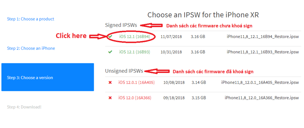 - Tiếp theo chọn firmware bạn muốn download về, có thể chọn các firmware thấp hơn