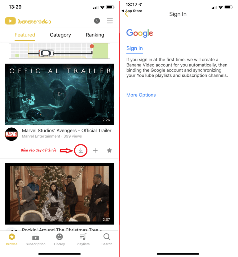 Để tìm kiếm một video bạn hãy nhấn chọn tab Search và nhập từ khoá vào đây, chọn video bạn muốn tải về, bạn sẽ thấy một tuỳ chọn Download. BananaVideo sẽ yêu cầu bạn đăng nhập bằng tải khoản Google, và cấp quyền truy cập tài khoản Google cho ứng dụng BananaVideo.