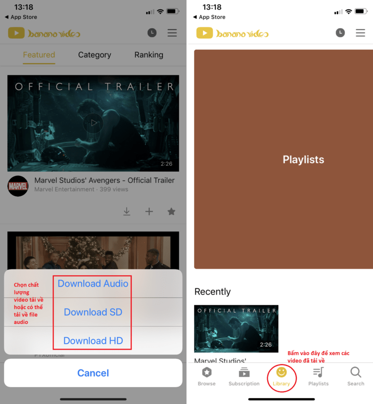Video/audio tải về sẽ nằm ở mục Library. Tại đây có một biểu tượng tải xuống, các video/audio mình đã tải về sẽ được hiển thị tại đây.