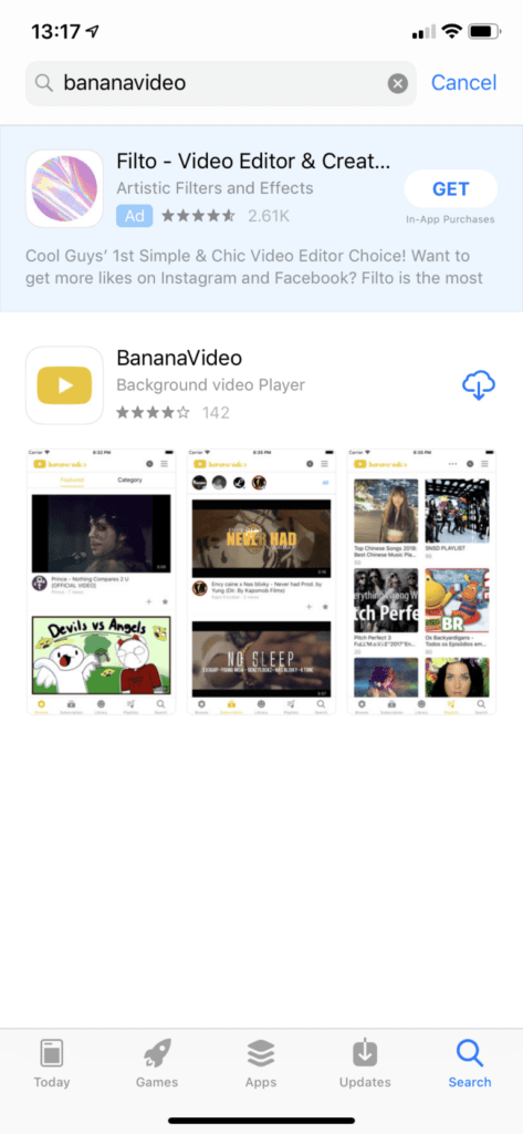 - Hoặc vào App Store, tìm kiếm với từ khoá “banavideo” và tải về.