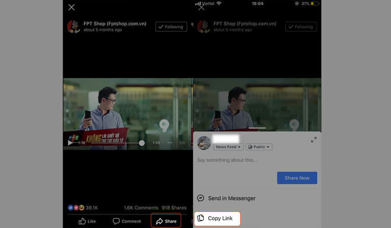 Bước 2: Sau khi đã cài đặt phím tắt theo link trên, hãy mở ứng dụng Facebook lên và tìm đến bài viết có video bạn muốn tải > Chọn vào Share > Chọn Copy Link.