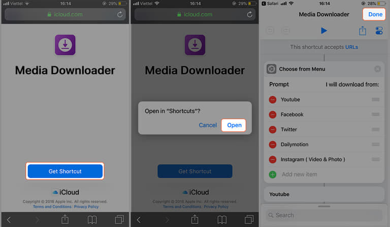 Bước 1: Đầu tiên, hãy vào link bên dưới bằng trình duyệt Safari trên iPhone. Làm theo các bước như ảnh dưới để cài đặt phím tắt.