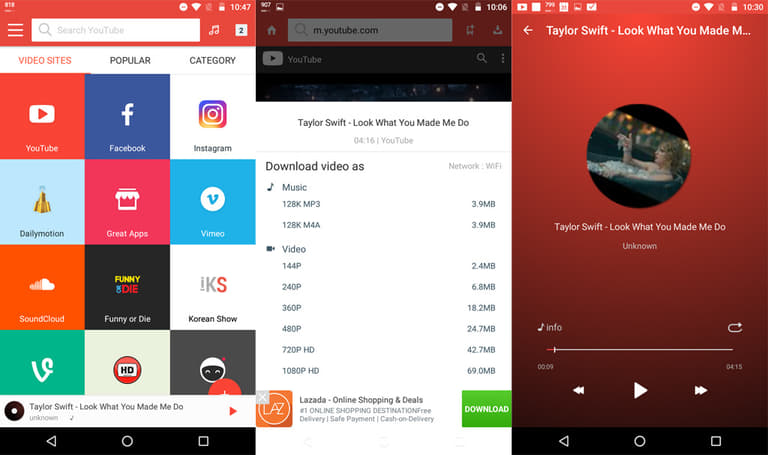 Không chỉ tương thích với số lượng lớn dịch vụ chia sẻ video và hầu hết mạng xã hội hiện nay như Facebook, Instagram, Dailymotion, Vimeo, SoundCloud v.v… ứng dụng này còn sở hữu giao diện đẹp mắt, có thể mở rộng thành một trình nghe nhạc hoặc video mini, cho phép chuyển đổi trực tiếp video thành định dạng MP3 hoặc M4A tùy ý. Nói chung, Snaptube rất sứng đáng để bạn dùng thử!